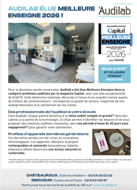 * Palmarès réalisé par le magazine Capital, en partenariat avec l’institut d’études Statista, auprès de plus de 15 000 consommateurs. 1. Test non médical. 2.Sur prescription médicale. Audilab Berry, SAS au capital de 8000 €, 8 bis rue Molière, 36000 Châteauroux, RCS Châteauroux 452 14 0536.Crédits images : Oticon, Audilab.