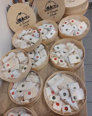 Je propose un large choix de fromages de chèvre, de vache et de brebis, que j’affine moi-même dans ma cave. Pour la période des fêtes, la sélection s’enrichit de fromages de chèvre à la truffe et de créations aux épices hivernales. En complément, on retrouve les délicieux yaourts Bordier de Saint-Malo, fabriqués par un fermier du Morbihan, ainsi que les pavés de Talleyrand de la ferme de Valasson à Buxières-d’Aillac. Sans oublier les savoureux yaourts de brebis du Cher, très appréciés des gourmets