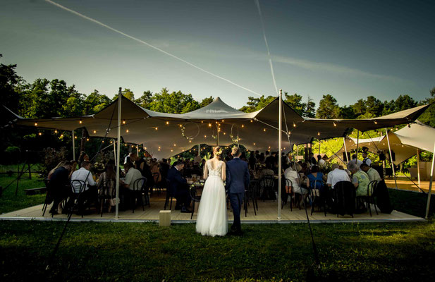 Nous avons fait le choix d’avoir des poteaux en bois pour intensifier ce côté naturel et élégant. Nous installons systématiquement des guirlandes guinguettes blanches qui participent à l’ambiance générale à la nuit tombée. L’effet « dedans dehors » plaît aussi énormément. Vous profitez de la nature tout en ayant un espace de réception et cela renforce le côté expérience inédite pour les invités.